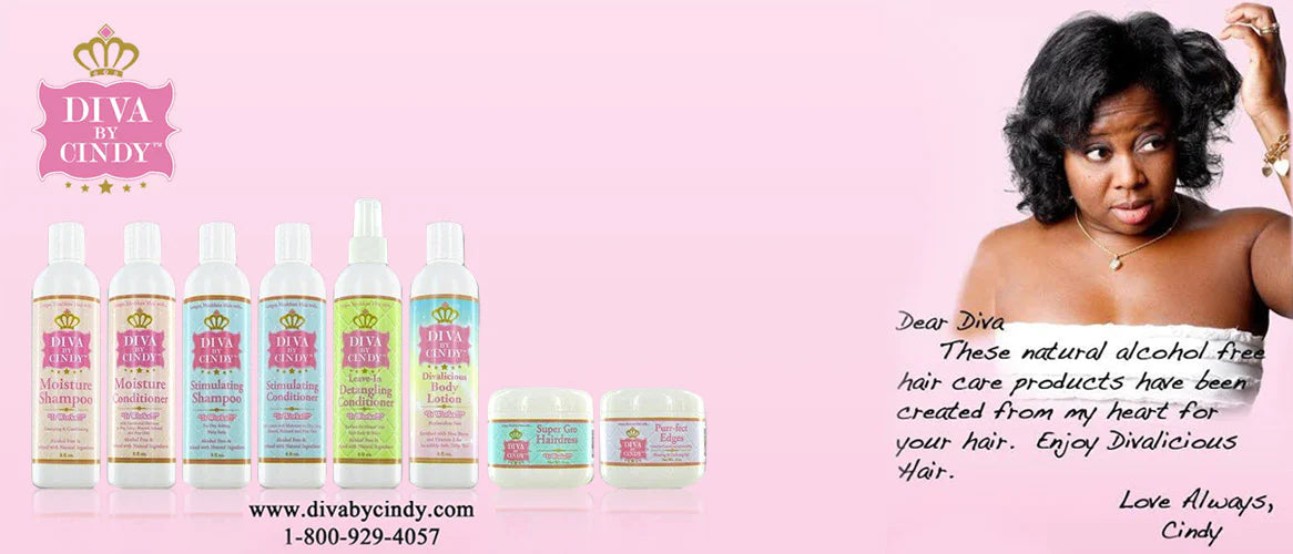 DIVA BY CINDY is a revolutionary hair care line developed to eliminate your hair woes. Our mission is to promote the growth of longer, healthier hair with products that are natural and alcohol-free. DIVA BY CINDY products are enriched with healing ingredients such as Panthenol (B Vitamins), aloe, rosemary, horsetail, nettles, peppermint, menthol and camphor which stimulate the scalp and promotes circulation and hair growth while leaving your hair silkier and shinier. Our rinse-out and leave-in conditioners penetrate the hair shaft to infuse the hair with the moisture and nutrients it needs. Our products are also formulated to assist cancer patients undergoing chemotherapy and experiencing hair loss as well as individuals with thyroid disorders on thyroid medications. Women who experience hair shedding and hair loss from hypertension and anti-hypertensives and tension and traction alopecia have also found our products to be beneficial. The extraordinary detangling ability of DIVA BY CINDY products keep hair on the head instead of stuck in the comb or on the floor giving you longer, healthier divalicious hair. We also use proceeds from the sale of our hair products to support victims of domestic violence. Our program is called the "Diva Project." Log onto : www.thedivaproject.org, to find out how you can help make a difference.